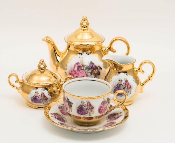 6 CUPS, SAUCERS (AND PLATES), CREAMER, SUGAR AND TEA POT