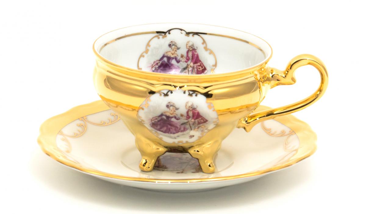 GLORIA'S MOST SELLING CUP ON FOUR FEET WITH LOVE STORY #51 PINK AND PURPLE PICTURE RIBBON AND GOLD COATING OF 24 CARATS